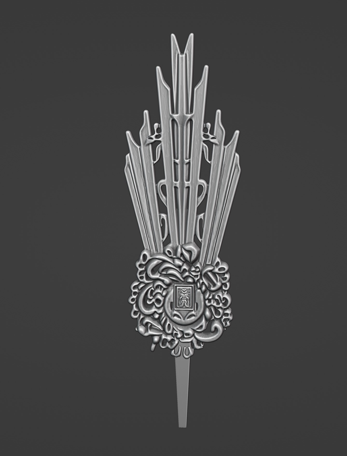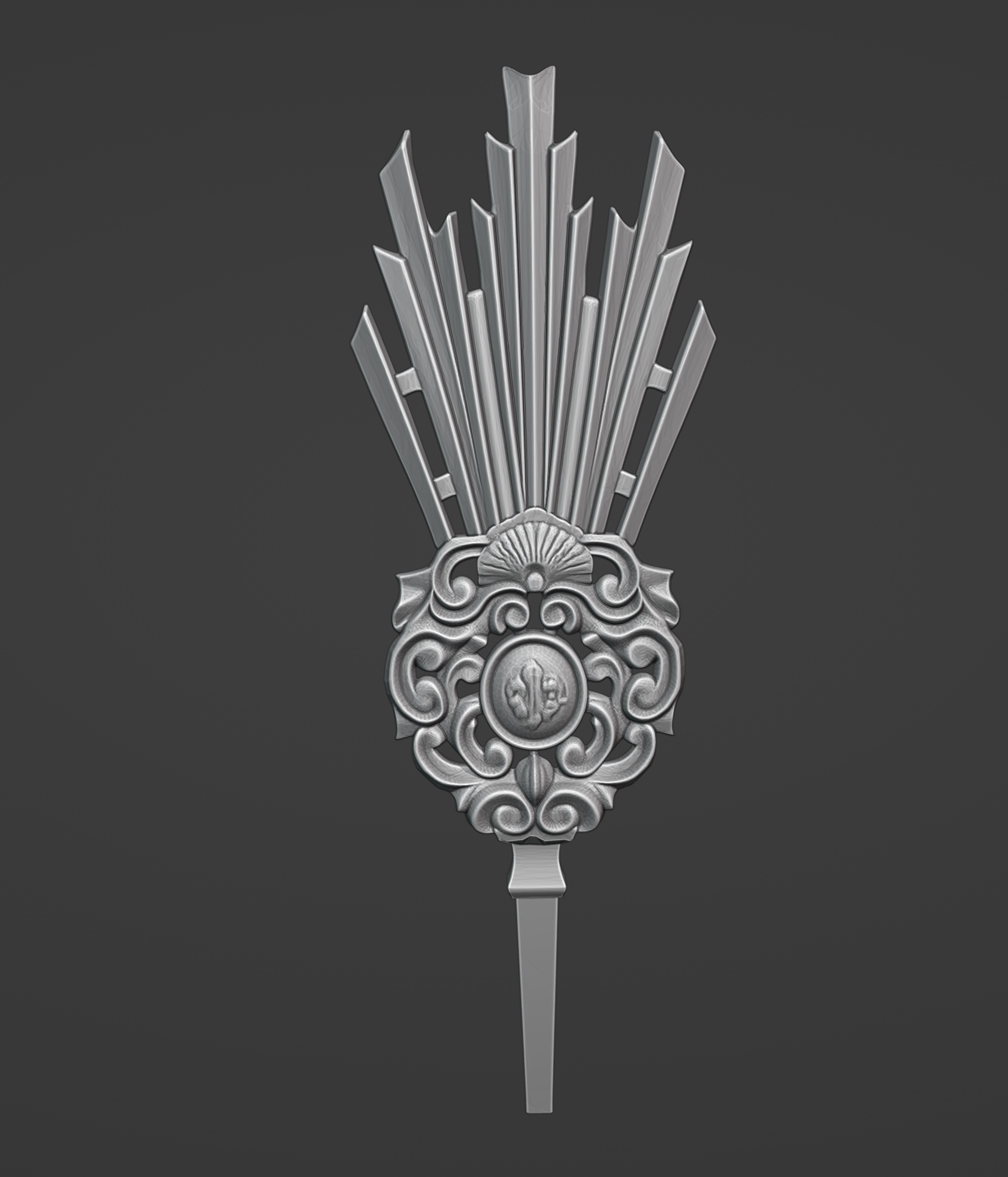• Haz de Rayos Arquitectónico: La potencia se proyecta hacia el exterior mediante tres grupos de rayos estilizados. El diseño se aleja de lo tradicional mediante un perfil escalonado y geométrico, con aristas marcadas que imitan la estética de los pináculos arquitectónicos. El grupo central, de mayor altura, otorga a la imagen una silueta esbelta y equilibrada.